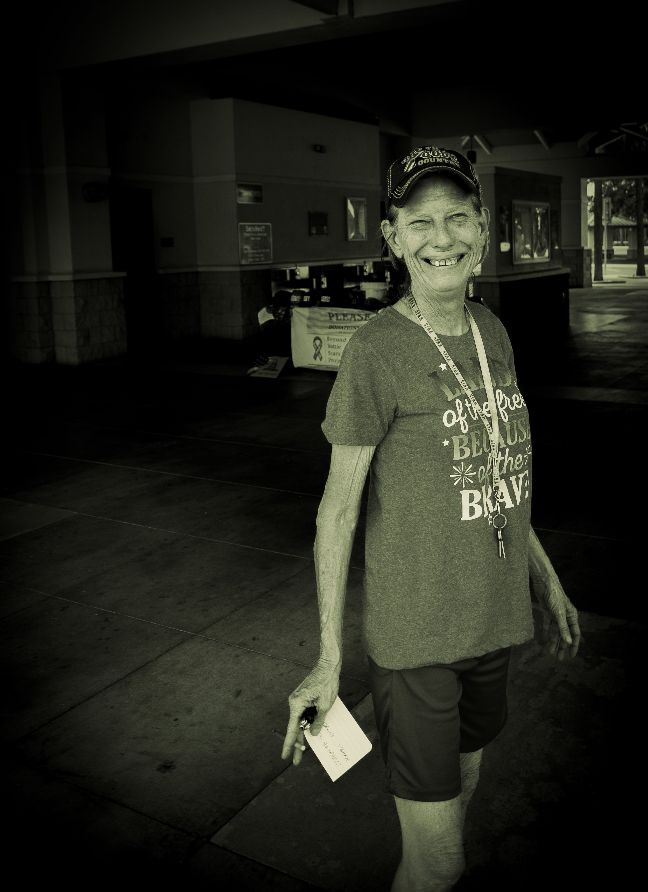Karen volunteers for Veterans In Need Foundation. Their motto is "Veterans Helping Veterans." She lives in Tampa and is dropped off at rest stops in the Tampa Bay area including the northbound Skyway Bridge and the Hillsborough County rest area's. They drop her off in the morning and is there most of the day selling patriotic caps and badges, as well as soliciting contributions for this veterans support group.