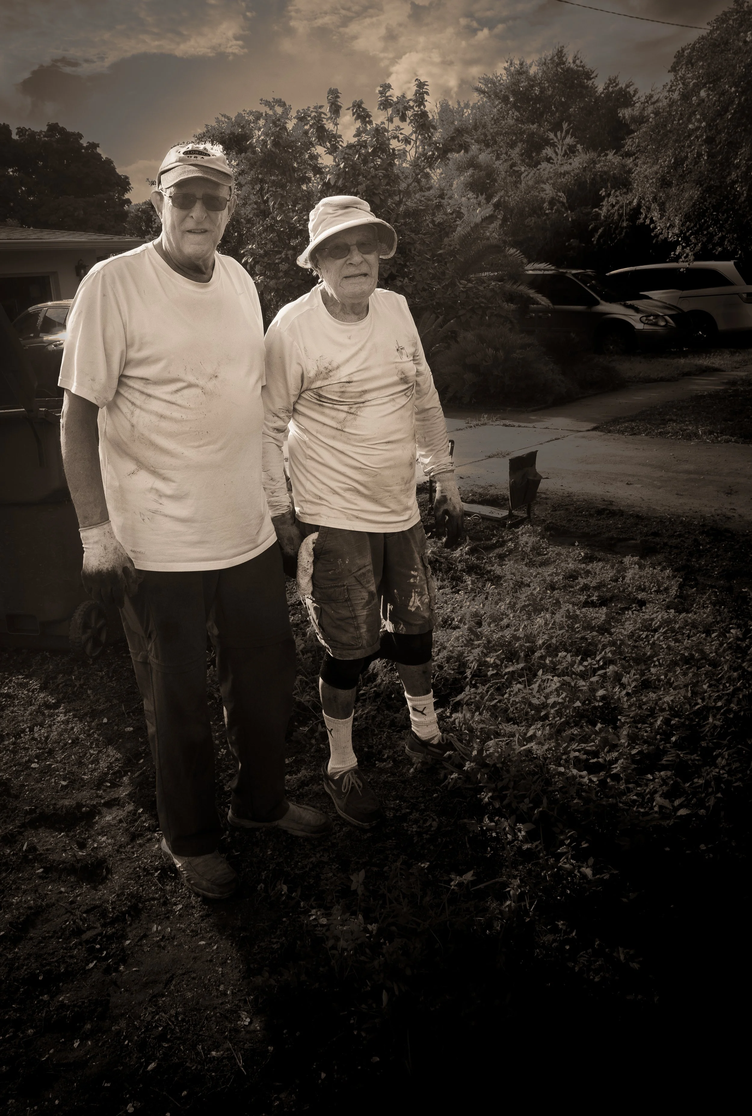 Bob and Anthony live nearby and are both horticulturists. They work hard, lovingly care for, and enjoy their yard. Riding my bike on an early, hot, summer morning I stopped to talk. Even though they had been working since first light, (to avoid the heat of the day), and were dirty from hours on their knees pulling weeds - they agreed to making this picture. They are good people!